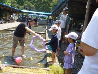 子供達は水着で生簀に入りあゆを捕まえて、元気いっぱい。